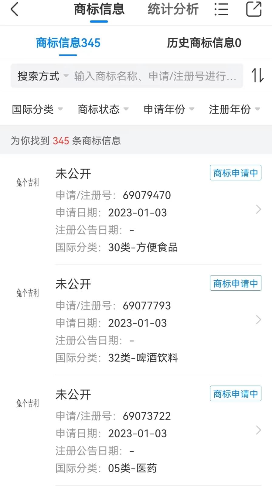 1月12日消息,天眼查信息顯示,近日,東方甄選直播間關(guān)聯(lián)公司東方優(yōu)選(北京)科技有限公司申請注冊多個(gè)“兔個(gè)吉利”商標(biāo),國際分類為方便食品、啤酒飲料、醫(yī)藥等,當(dāng)前商標(biāo)狀態(tài)均為申請中。