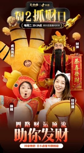 “抓財(cái)日”直播不僅僅只是主題的新穎設(shè)置,在直播內(nèi)容也秉承一貫的“沙雕”、“有趣”的風(fēng)格,直播間邀請“招財(cái)界的好朋友”——搖錢樹、錦鯉、招財(cái)貓、財(cái)神,加上王小鹵“抓財(cái)手大大大大大禮包”,一共五路招財(cái)頂流“現(xiàn)場做法”。