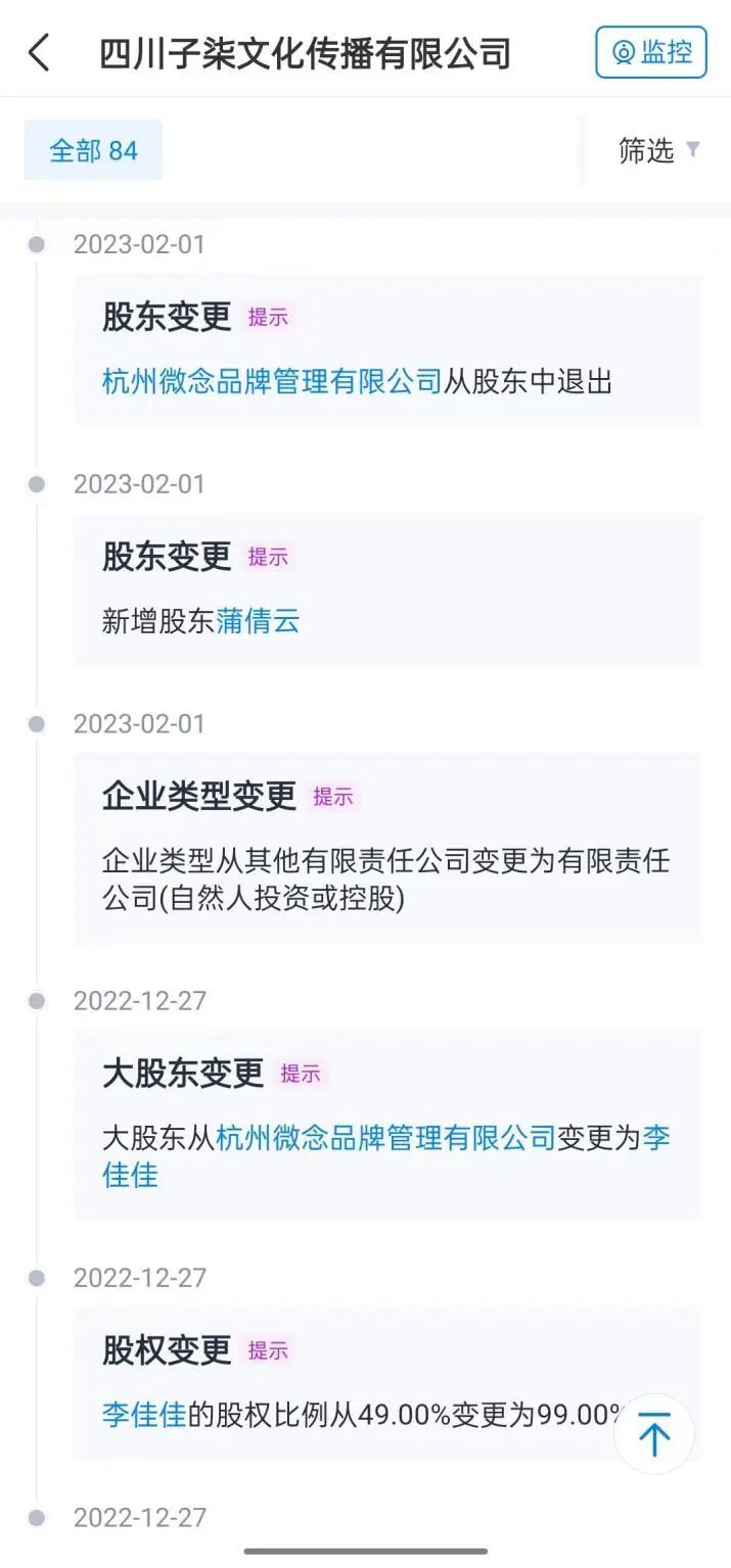 至此,李子柒、蒲倩云分別持股99%和1%。與此同時(shí),李子柒拿回了“李子柒”IP品牌,掌握了主動(dòng)權(quán)。